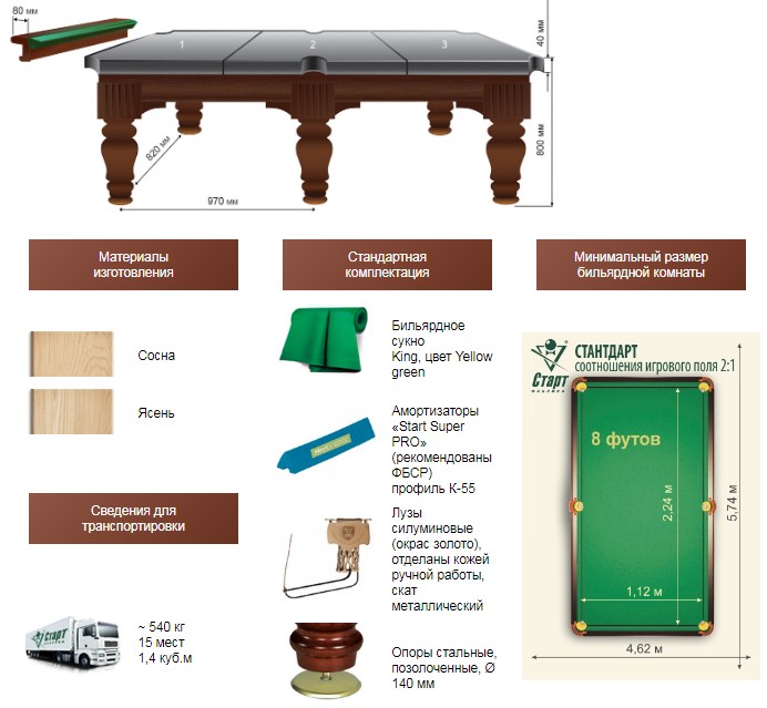 В отличие от стола Барон, лафет этого стола изготавливается из деревянного массива ясеня/сосны без шпонирования, а также здесь используется более экономичный вариант луз и чашек опор.